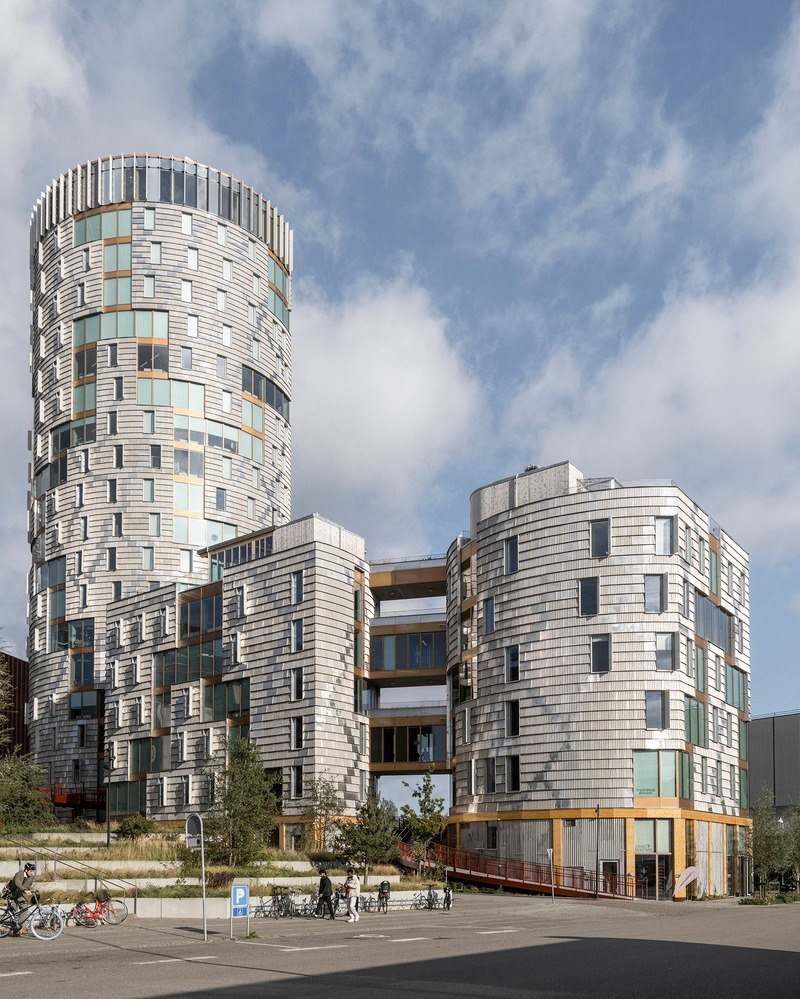 ساختمان «ترا» در بندر قدیمی آرهوس، دانمارک، که توسط Lendager Arkitekter طراحی شده است، با سیستم سازهای هیبریدی خود (ترکیب چوب و بتن کمکربن) توانسته الزامات ساختمانی برجهای چوبی بلند را برآورده کند. این پروژه یک گام مهم در توسعه معماری پایدار و زیستمحور محسوب میشود.
