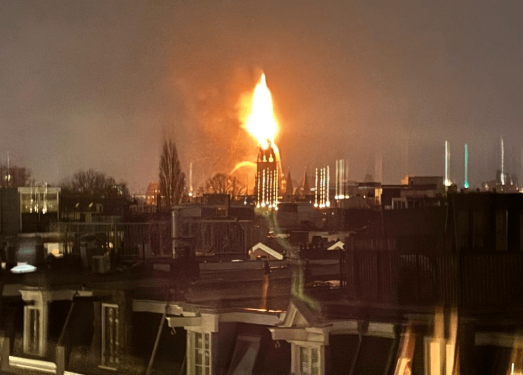سوختن مناره کلیسای تاریخی آمستردام در شعله های آتش