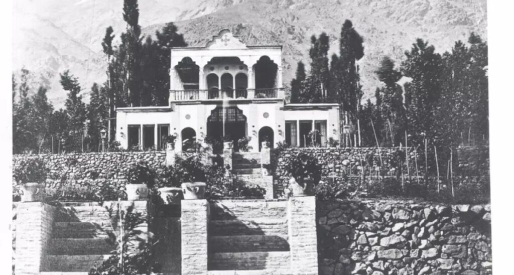 عکسی تاریخی از عمارت ملکالتجار در امامزاده قاسم که عبدالله قاجار آن را ثبت کرده و نمونهای خاص از معماری اعیانی تهران در دوران قاجار است.