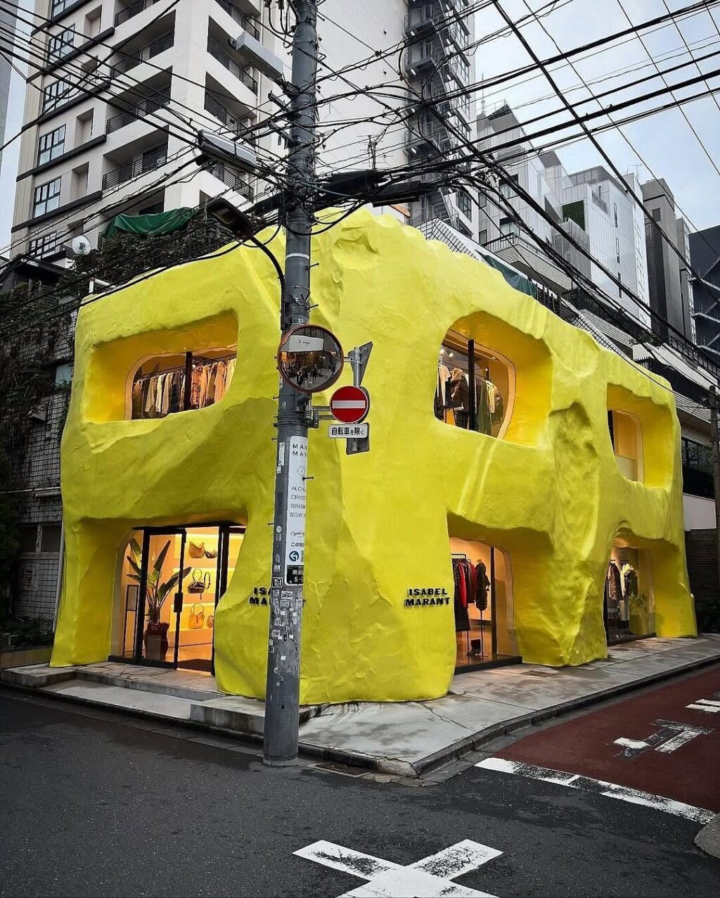 برند مد فرانسوی ایزابل مارانت شعبه جالبی در توکیو با یک طراحی نوآورانه و خیره‌کننده دارد که در محافل معماری به دلیل ترکیب متریال‌های خام و نورپردازی فلورسنت، به عنوان “پرچم‌دار عصر حجر” شناخته شده است.