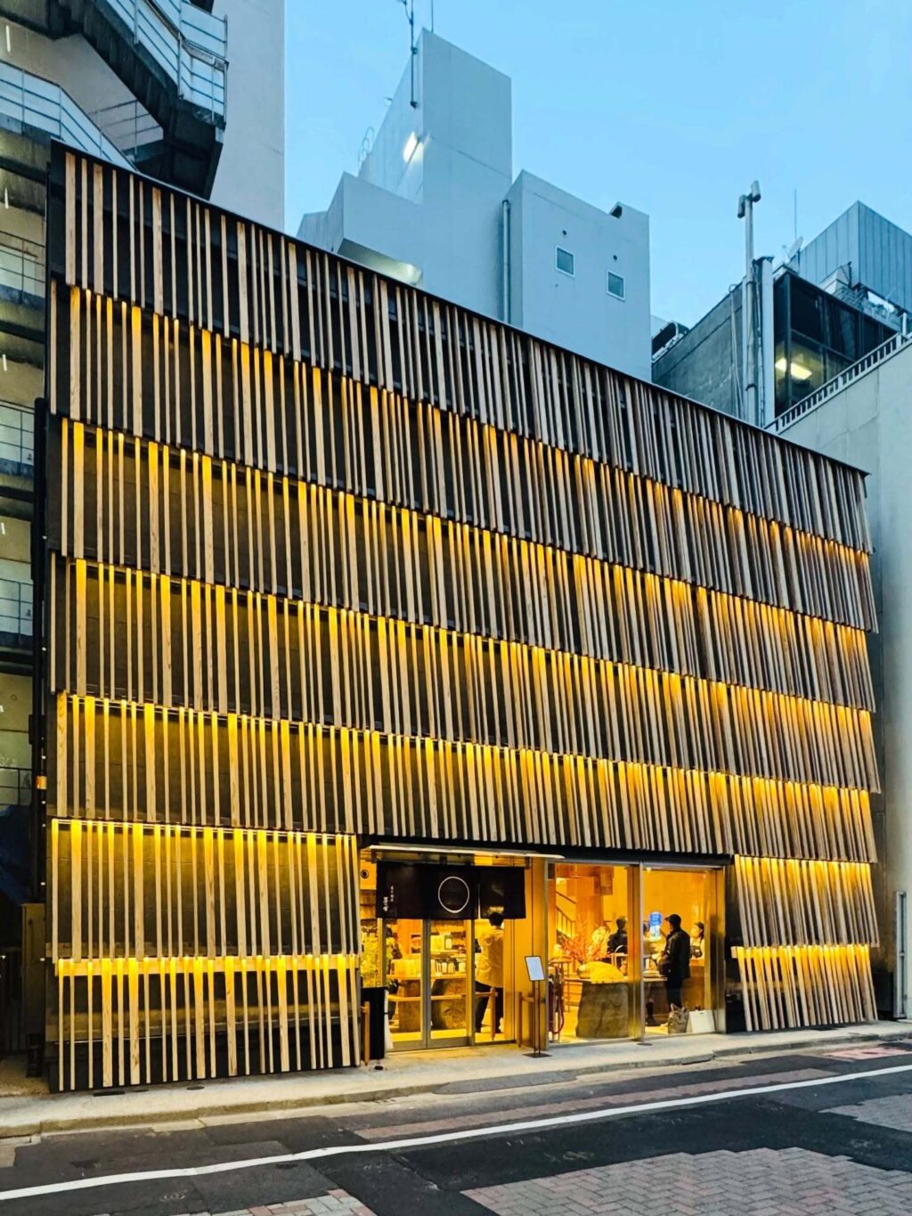 نورپردازی گرم و هوشمندانهای که از پشت این لوورهای چوبی انجام شده، ظاهری پویا و چشمنواز به نمای ساختمان بخشیده است و حس گرمی را به عابران منتقل میکند. این پروژه یک نمونه برجسته از ترکیب سنت معماری ژاپن (استفاده از چوب) با زیباییشناسی مدرن است.