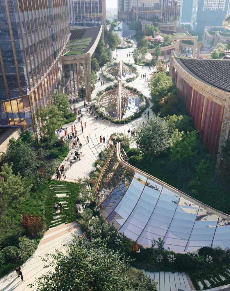 وقتی از فاصله دور مشاهده میشود، طرح به سه مقیاس تقسیم میشود، که با فضای سبز با خطوط بام باریک تحت تأثیر معابد محلی مجاور شروع میشود. این منطقه از چندین تراس بههم پیوسته در سطح خیابان برای بهبود پیادهروی و مناظر شهر استفاده کرده است. ساختمانهایی که با پوششهای سرامیکی طرحدار محلی در این ناحیه ساخته شدهاند، ادای احترامی به مجموعه سفالین ارتش تراکوتای چین هستند.